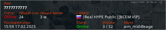 Играет на Counter Strike 1.6 сервере. Страна: РоссияПервый раз замечен 15:59 17.02.2025