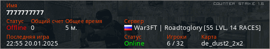Играет на Counter Strike 1.6 сервере. Страна: РоссияПервый раз замечен 22:51 20.01.2025