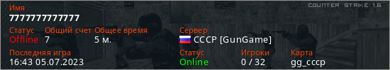 Играет на Counter Strike 1.6 сервере. Страна: РоссияПервый раз замечен 16:15 05.07.2023