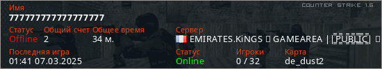 Последний раз был в сети 01:41 07.03.2025 Игрок с таким ником замечен на 6 серверах