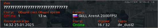 Последний раз был в сети 14:32 25.01.2025 Игрок с таким ником замечен на 5 серверах