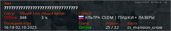 Играет на Counter Strike 1.6 сервере. Страна: РоссияПервый раз замечен 13:40 30.09.2024