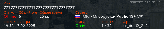 Последний раз был в сети 19:53 17.02.2025 Игрок с таким ником замечен на 30 серверах
