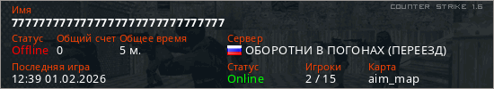 Играет на Counter Strike 1.6 сервере. Страна: РоссияПервый раз замечен 12:35 01.02.2026