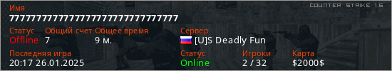 Играет на Counter Strike 1.6 сервере. Страна: РоссияПервый раз замечен 19:01 05.01.2024