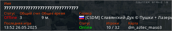 Последний раз был в сети 13:52 26.05.2025 Игрок с таким ником замечен на 30 серверах
