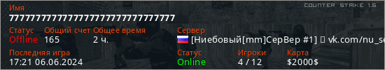 Последний раз был в сети 17:21 06.06.2024 Игрок с таким ником замечен на 30 серверах