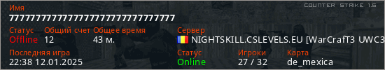 Последний раз был в сети 22:38 12.01.2025 Игрок с таким ником замечен на 30 серверах