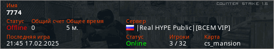 Играет на Counter Strike 1.6 сервере. Страна: РоссияПервый раз замечен 21:30 17.02.2025