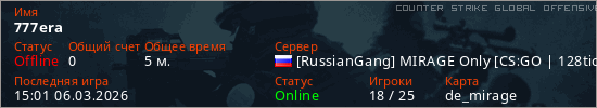 Играет на Counter Strike Global Offensive сервере. Страна: РоссияПервый раз замечен 14:31 06.03.2026