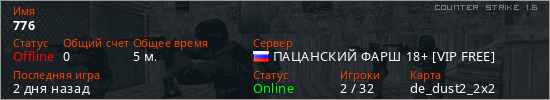 Играет на Counter Strike 1.6 сервере. Страна: РоссияПервый раз замечен 12:21 19.03.2026