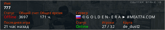 Играет на Counter Strike 1.6 сервере. Страна: РоссияПервый раз замечен 03:12 14.01.2023