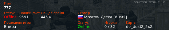 Играет на Counter Strike 1.6 сервере. Страна: РоссияПервый раз замечен 14:43 31.07.2020