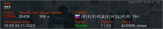 Играет на Counter Strike 1.6 сервере. Страна: РоссияПервый раз замечен 13:14 27.01.2019