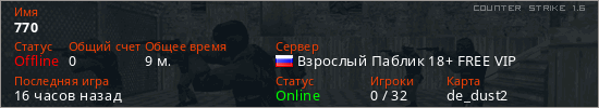 Играет на Counter Strike 1.6 сервере. Страна: РоссияПервый раз замечен 22:42 03.01.2026