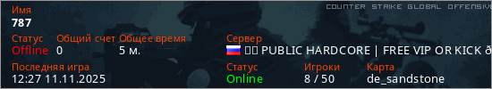 Играет на Counter Strike Global Offensive сервере. Страна: РоссияПервый раз замечен 12:25 11.11.2025