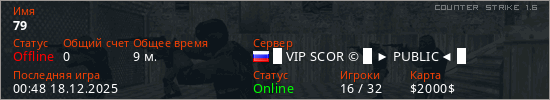 Играет на Counter Strike 1.6 сервере. Страна: РоссияПервый раз замечен 21:35 17.12.2025