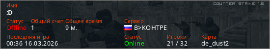 Играет на Counter Strike 1.6 сервере. Страна: РоссияПервый раз замечен 01:57 12.03.2026