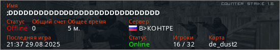 Играет на Counter Strike 1.6 сервере. Страна: РоссияПервый раз замечен 21:35 29.08.2025