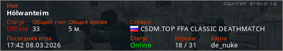 Играет на Counter Strike 1.6 сервере. Страна: РоссияПервый раз замечен 16:37 08.03.2026
