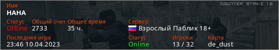 Играет на Counter Strike 1.6 сервере. Страна: РоссияПервый раз замечен 00:26 03.06.2020