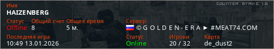 Играет на Counter Strike 1.6 сервере. Страна: РоссияПервый раз замечен 10:47 13.01.2026