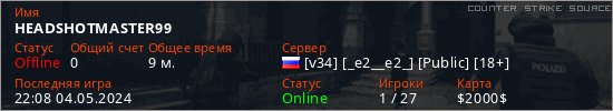 Играет на Counter Strike Source сервере. Страна: РоссияПервый раз замечен 16:49 04.05.2024