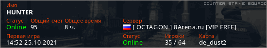 Играет на Counter Strike Source сервере. Страна: РоссияПервый раз замечен 14:52 25.10.2021