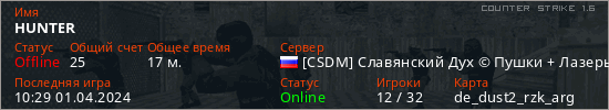 Играет на Counter Strike 1.6 сервере. Страна: РоссияПервый раз замечен 14:41 20.03.2024