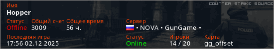 Играет на Counter Strike Source сервере. Страна: РоссияПервый раз замечен 16:29 30.04.2023