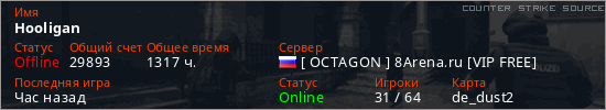 Играет на Counter Strike Source сервере. Страна: РоссияПервый раз замечен 20:28 08.09.2021