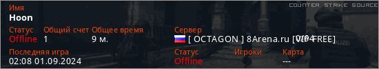 Играет на Counter Strike Source сервере. Страна: РоссияПервый раз замечен 19:57 12.11.2023