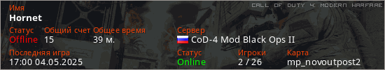 Играет на Call of Duty 4: Modern Warfare сервере. Страна: РоссияПервый раз замечен 19:16 14.11.2024
