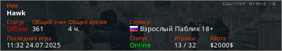 Последний раз был в сети 11:32 24.07.2025 Игрок с таким ником замечен на 31 сервере