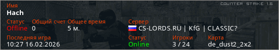 Играет на Counter Strike 1.6 сервере. Страна: РоссияПервый раз замечен 10:25 16.02.2026