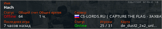 Играет на Counter Strike 1.6 сервере. Страна: РоссияПервый раз замечен 12:20 07.01.2025