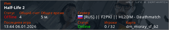 Играет на Half Life 2 DeathMatch сервере. Страна: РоссияПервый раз замечен 13:38 06.01.2026