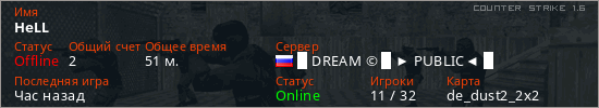Играет на Counter Strike 1.6 сервере. Страна: РоссияПервый раз замечен 10:46 12.03.2026