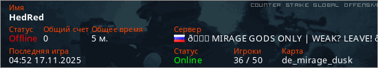 Играет на Counter Strike Global Offensive сервере. Страна: РоссияПервый раз замечен 04:50 17.11.2025