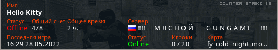 Играет на Counter Strike 1.6 сервере. Страна: РоссияПервый раз замечен 12:25 24.05.2022
