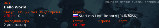 Играет на Counter Strike Global Offensive сервере. Страна: РоссияПервый раз замечен 11:49 19.01.2026
