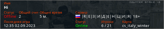 Играет на Counter Strike 1.6 сервере. Страна: РоссияПервый раз замечен 12:29 02.09.2023