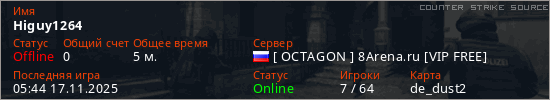 Играет на Counter Strike Source сервере. Страна: РоссияПервый раз замечен 05:38 17.11.2025