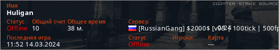 Играет на Counter Strike Source сервере. Страна: РоссияПервый раз замечен 20:43 24.01.2024