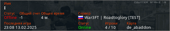 Играет на Counter Strike 1.6 сервере. Страна: РоссияПервый раз замечен 23:02 13.02.2025