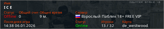 Играет на Counter Strike 1.6 сервере. Страна: РоссияПервый раз замечен 13:24 05.01.2026