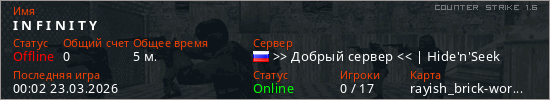 Играет на Counter Strike 1.6 сервере. Страна: РоссияПервый раз замечен 23:24 22.03.2026