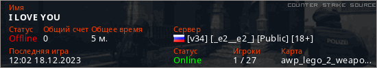 Играет на Counter Strike Source сервере. Страна: РоссияПервый раз замечен 12:00 18.12.2023
