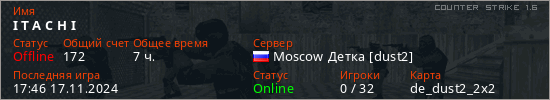 Последний раз был в сети 17:46 17.11.2024 Игрок с таким ником замечен на 9 серверах
