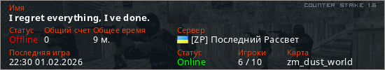 Играет на Counter Strike 1.6 сервере. Страна: УкраинаПервый раз замечен 17:51 01.02.2026
